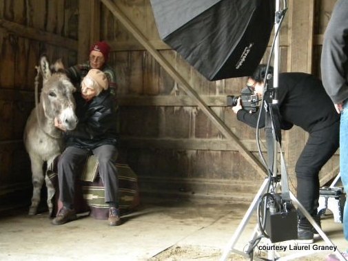 Louise and Christine Sierau pose with therapy donkey Billy Boy for noted documentary photographer Mary Ellen Mark during a shooting session for Martha Stewart's Whole Living magazine. |