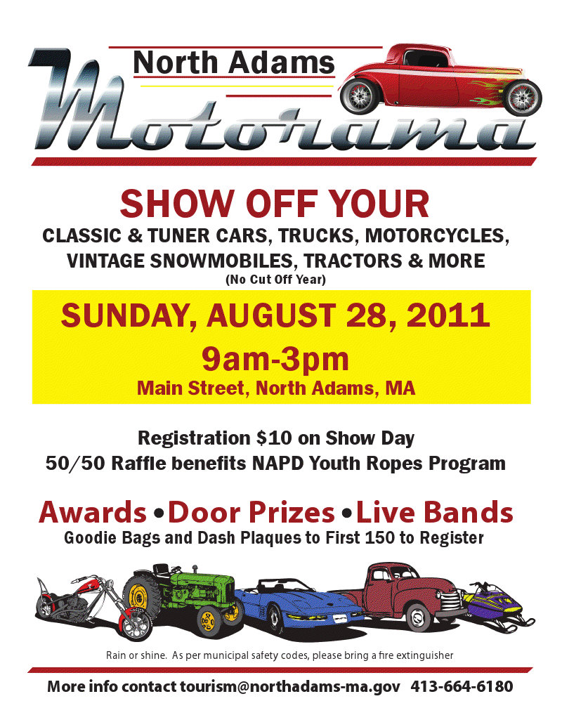 Update Aug. 25: The North Adams Motorama scheduled for Sunday, Aug. 28, has been postponed until Sunday, Sept. 25, because a forecast for severe weather.![]() |