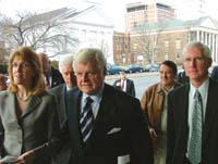 | Senator Edward M. Kennedy walks to the Colonial Theatre on South Street in Pittsfield Monday, flanked by the theater's executive director, Susan Sperber, left, and Howell M. Palmer, Colonial Theatre Association board president, right. |