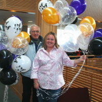 <L2>College Assistant Director of Campus Life Jessica Gulley met Where'd You Get That?! business co-owner Ken Gietz just outside the campus life office arena and helped him maneuver two large gold, black, and white-with-imprinted-cows balloon bouquets through the area.