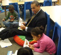 Sitting on the floor with Nancy Knauth's kindergarten class, the governor learned a few words along with children in his circle and took his turn in reading aloud from "Peg the Hen."