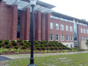 The buildings are the first phase in an ambitious building project that includes realignment of the campus and the construction of a new library. The academic buildings are designed to almost as a continuous vision across a north/south axis - interrupted right now by Sawyer Library. In fact, the new buildings have been constructioned as close to Sawyer as permissible.