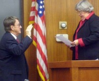 | City Clerk Marilyn Gomeau gives the oath to newly re-elected Council President Alan Marden. Top photo, she gives the oath to Vice President Richard Alcombright. |
