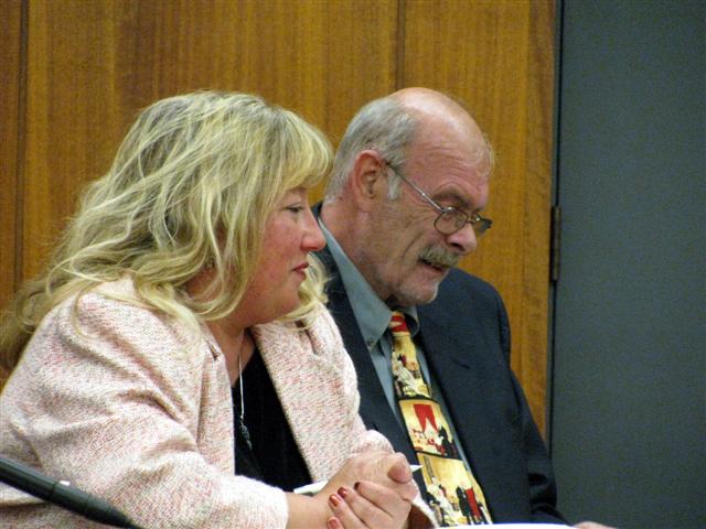 Billings, wearing a tie showing George Washington at the Constitutional Convention, sits next to Councilor Lisa Blackmer. |