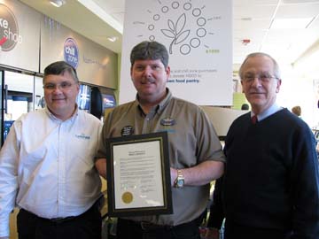 ![]() Cutting, Richards and Town Manager Peter Fohlin pose with a town proclamation recognizing Cumberland Farms. |