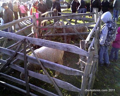 Antique tractors advertised were not seen at the event, and a truck bearing oxen from Worthington broke down en route, but modern tractors from Pittsfield Lawn & Tractor were on display, and horses provided by Bill Roberts. A natural highlight were two Merino sheep, brought by Donna Chandler of Pittsfield. The Chandler family lives in the old William Brattle House on Williams Street, the oldest remaining house in Pittsfield, a fact that provided a nice historical continuity to the bicentennial event.
