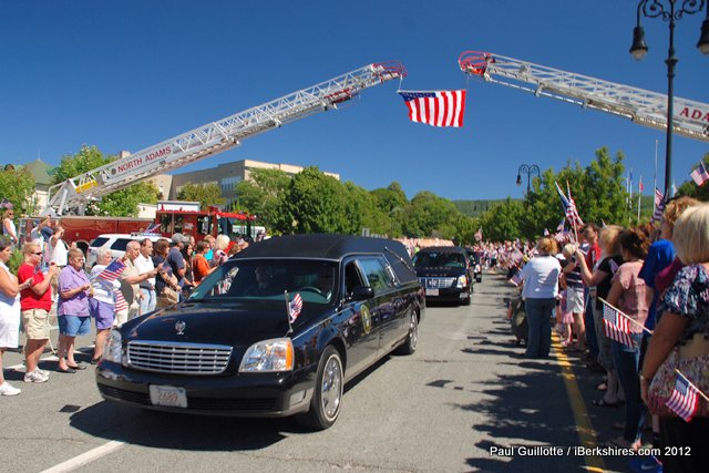 The hearse was escorted by the Berkshire County sheriff's department, a state police and North Adams police cruisers, two vehicles with immediate family members and motorcyclists including members of the Patriot Guard Riders, a group dedicated to ensuring deceased members of the armed forces are treated with respect, and American Legion Riders.