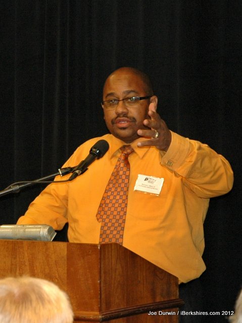 ![]() Paul Durwin speaks to the Pittsfield Community Television's 26th annual meeting after being presented a 'Cassie' Award by Access Pittsfield coordinator Norman Shaffer. |