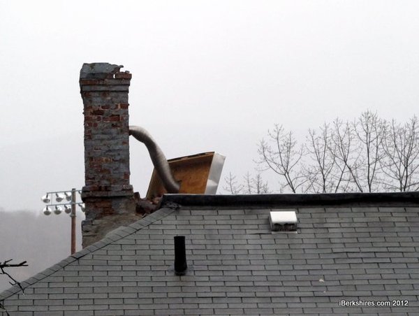 A chimney collapsed in North Adams, a portion of a roof in Lenox and a youngster barely missed a tree entering her room, but by 10 p.m. there appeared to be no serious injuries or major damage.