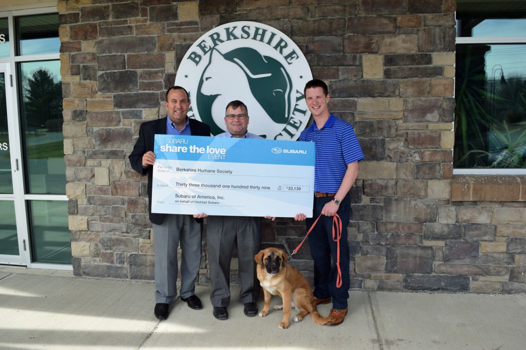 Sharing the love: During the Berkshire Humane Society’s 13th annual Cause for Paws Radiothon on April 4, George Haddad, Mike Coggins, and Chris Kramek stopped by Live 95.9 and WUPE to present the Berkshire Humane Society with a rather large contribution. As part of its ongoing support of local communities, Subaru of America and Haddad Subaru presented a check to Berkshire Humane Society for $33,139.