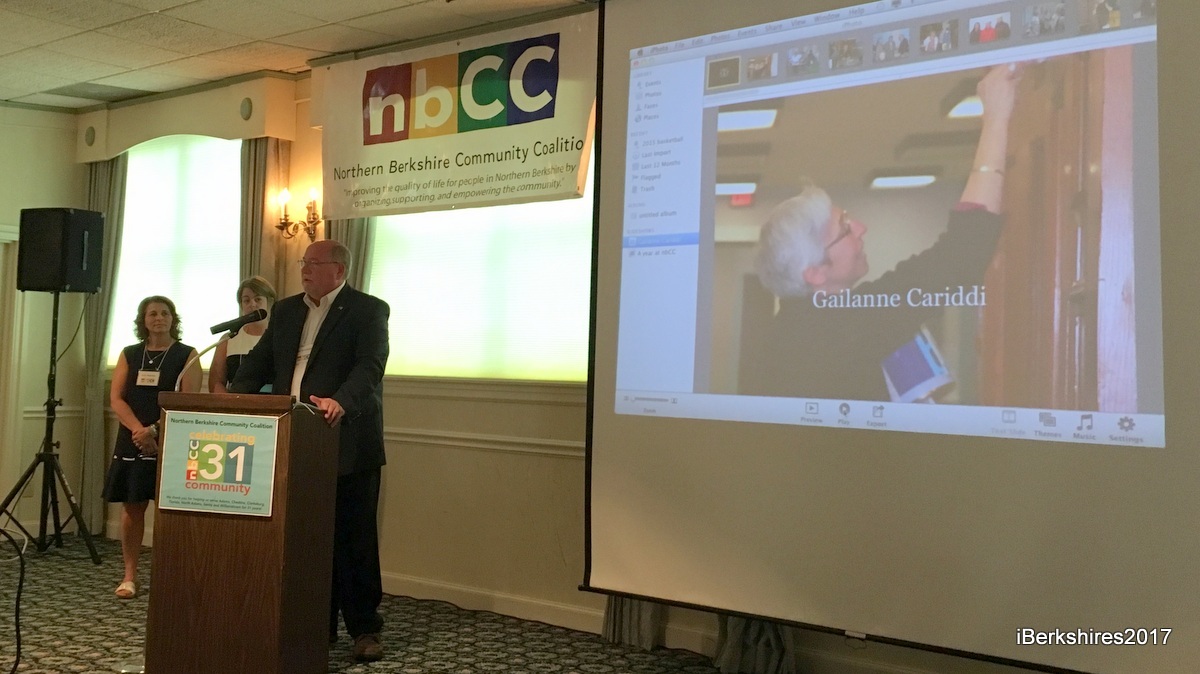 North Adams Mayor Richard Alcombright speaks before a slideshow remembering the late state Rep. Gailanne Cariddi at the NBCC annual meeting on Friday.