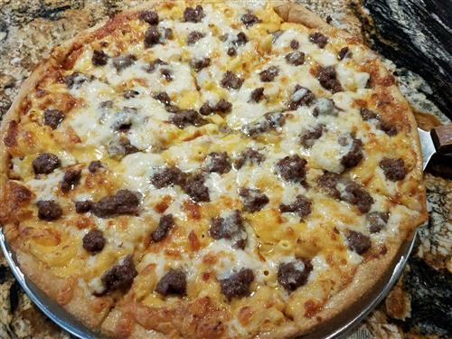 We start with macaroni blended with our secret cheese sauce. Fresh ground beef topped with Mozzarella & Cheddar Cheese then baked to Mac Attack perfection.