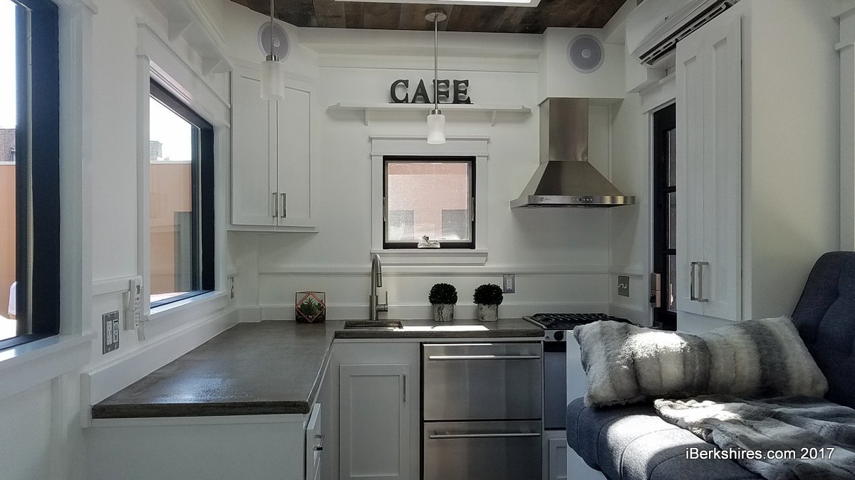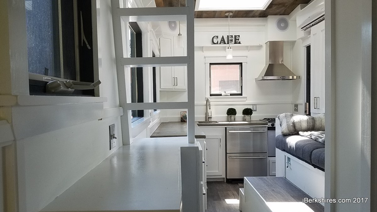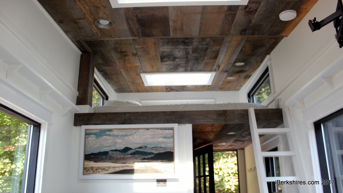 Their show model was outfitted with a stainless three-burner gas range and oven, a two-drawer refrigerator, tiled shower, convertible couch and loft bed, along with plenty of cupboards and cubby for storage. The ceiling was blue-weathered barnboard from Potvin's in Vermont. The unit was also outfitted with high-end features such as Bluetooth switches, an HVAC unit and a back porch with fold-up stairs and unique branch railings.