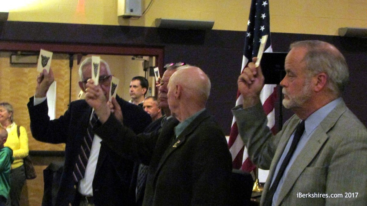 Cory Thurston, right, and the three members of the Williamstown Prudential Committee vote yes at Tuesday's special fire district meeting.