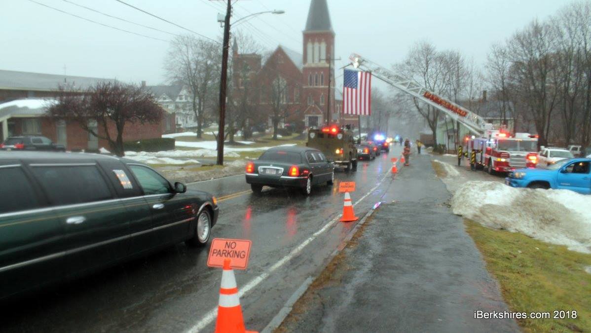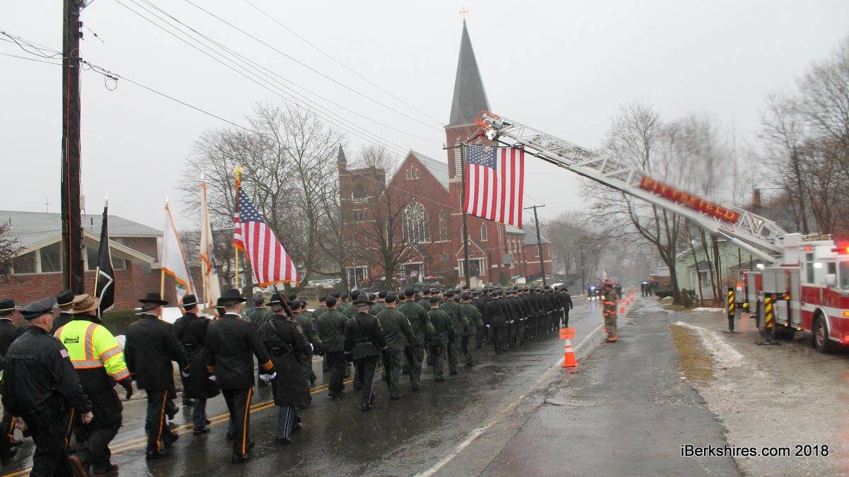 Back home, local police departments continued the escort and numerous members of the Fire Department and emergency medical technicians were on hand to honor Winston. The Fire Department hung a large American flag from its ladder truck on Pontoosuc Avenue for the procession to march under on its way to the church.