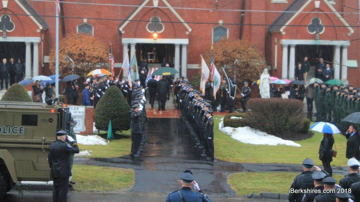 That was the broadcast over local police radios Friday morning. Pittsfield Policed Lt. Michael Winston died unexpectedly while on vacation in Fort Myers, Fla., last Friday and this Friday, officers from multiple departments marched in a downpour, escorting the Special Response Team vehicle carrying his casket to St. Charles' Church for his funeral.