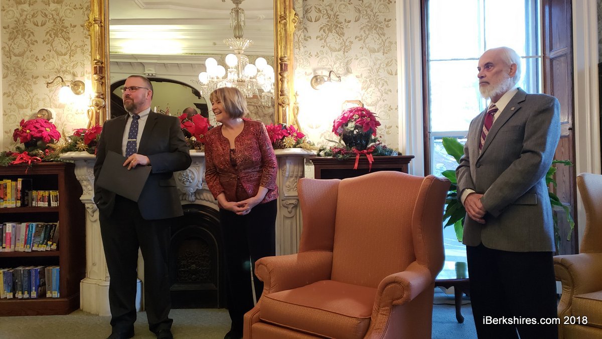 Mayor Thomas Bernard, left, Library Director Mindy Hackner and North Adams Historical Society President Charles 'Chuck' Cahoon in the library's front parlor on Tuesday for the announcement of bequests from the estate of Rep. Gailanne Cariddi.