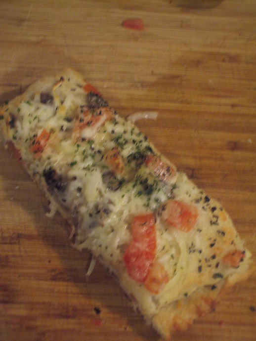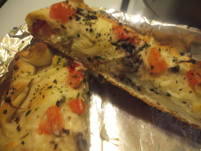 I think we were both glad that I gave it a try, and hopefully my bad luck in the kitchen is all gone now. This bread was AMAZING!! It was super simple to make, and the end result was super tasty! All you need is some of your favorite veggies and cheese, some good olive oil, and some pre-made pizza dough, such as Pilsbury. I ended up using mozzarella, thinly sliced onions, roasted red peppers, tomatoes, and sliced mushrooms.