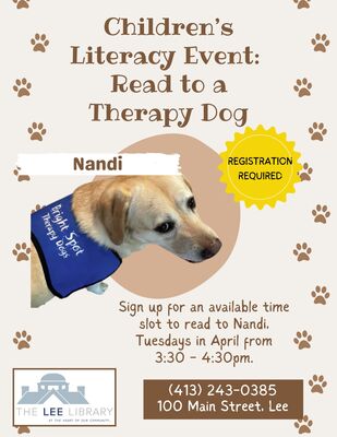 Nandi, the Therapy Dog, will be available for a children’s literacy event at the Lee Library, 100 Main St., Lee on Tuesdays in April. Available time slots begin at 3:30pm. Registration is required. Please contact the Lee Library at (413) 243-0385 or sign up at the Circulation Desk. leelibraryma.org
