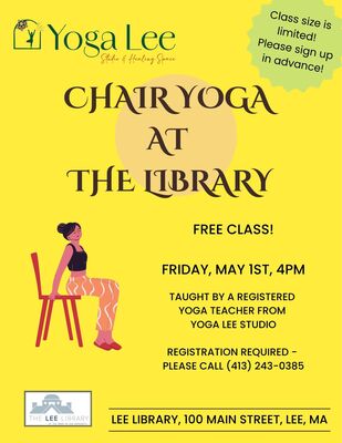 Yoga Lee Studio hosts this chair yoga class at the library, 100 Main St. This free class will be taught by a registered yoga teacher. Registration is required. Contact the library at 413-243-0385 or sign up at the Circulation Desk.