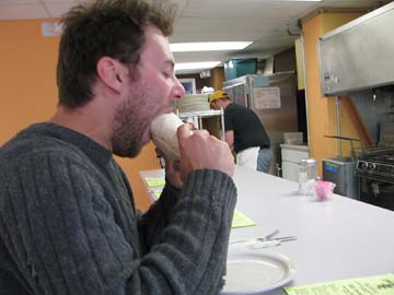 Peter Camacho chows down on a foot-long vegetarian burrito at Los Amigos. |