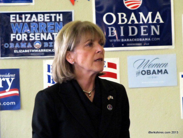 The attorney general announced last month that she would be seeking election in 2014. This is her second visit to the Berkshires since announcing; she was to receive the Northern Berkshire Business and Professional Women's Woman of Achievement Award in the evening.