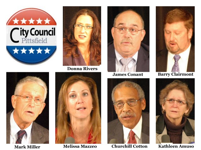 Incumbents Barry Clairmont, Churchill Cotton and Melissa Mazzeo laid out their records and positions against those of hopefuls Kathleen Amuso, James Conant, Mark Miller and Donna Rivers in a debate held at Berkshire Community College on Monday, ranging over issues such as school budget, new business development, and the future of some city buildings.