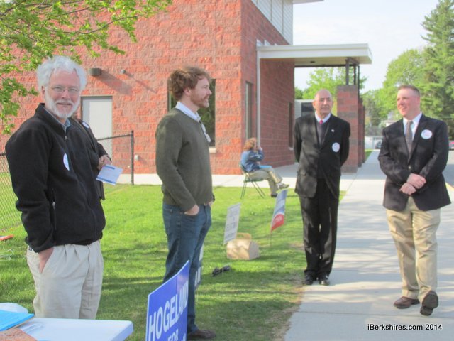 Williamstown selectmen winners Andrew Hogeland, left, and Hugh Daley, earlier on Tuesday with fellow candidates Jack Nogueira and Gary Fuls.