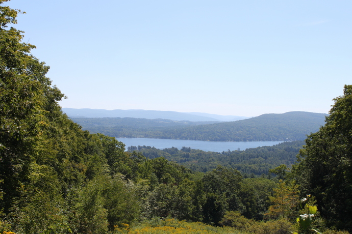 Situated between West Stockbridge Mountain and Lenox Mountain, the overlook which is owned by the Berkshire Natural Resources Council, is located on Yokun Ridge. The sight is essentially a circular parking lot surrounded first by a stone wall and then densely foliated land and then woods (there is also a path that I will be exploring most likely during the hurricane!). On a clear day, which it was, the blue oasis of the Stockbridge Bowl and its surrounding hills and mountains, can be seen through an opening (which was cleared to make room for a pipeline years ago) in the trees and landscape. Perched on the stone wall with my locally grown apple and my camera,