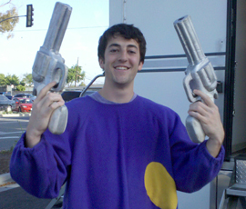 Drury High School and Williams College grad James Dunn poses with a couple of props he picked up on set for an ESPN commercial. |