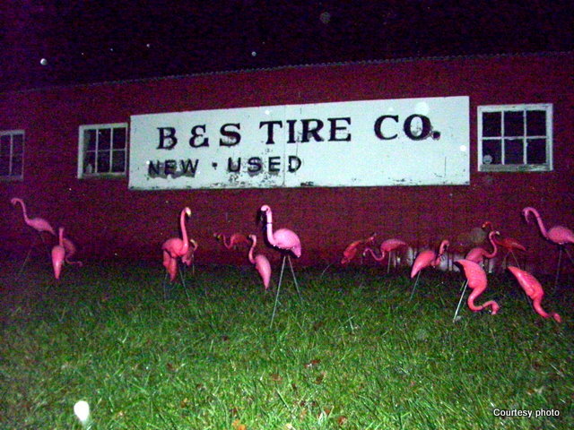 A few days later the flamingos were gone. I was saddened to think that the local police had removed the impressive flock. But just a few yards up the road, there they were!  All bunched up in front the tire place. I was relieved. So they hadn’t been removed, just moved.