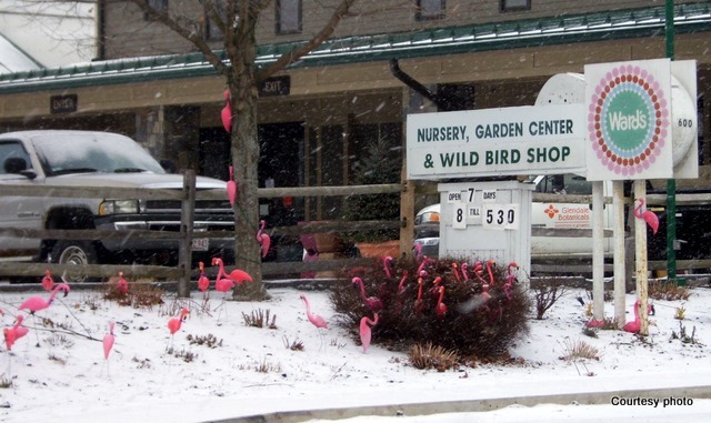 That’s when I saw them; an entire flock of pink, plastic flamingos jutting out against the gray November landscape, impossible to miss. Of course, I laughed, out loud, assuming that their presence was some kind of revolt by the owner of the Route 7 Grill in response to having a cow on his front lawn. It wouldn’t be the first time that someone has responded to a neighbor’s complaint with even more absurd yard toys.