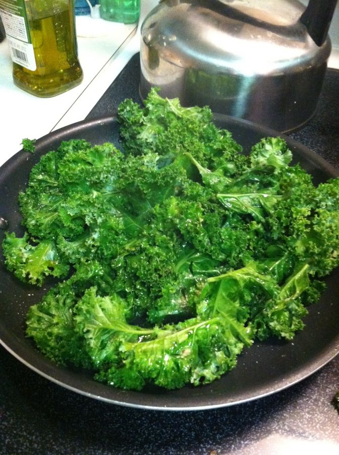 Take a bunch of kale and rinse well, especially if it is organic or locally grown—a lot of dirt and other things can collect in the curly leaves and stems.* Cut the leaves from the stems by laying the kale flat, smooth side up, and slicing with a knife along the stem. Discard the stems or save them for homemade veggie stock. Add EVOO to a frying pan with some minced garlic. Once the garlic is cooked through add the kale along with a few teaspoons of water. While this is cooking (remember to keep stirring it or it will brown) juice a fresh lemons. Throw that in the pan with a pinch of sea salt. And that’s it! Add some red pepper flakes if you want some spice.