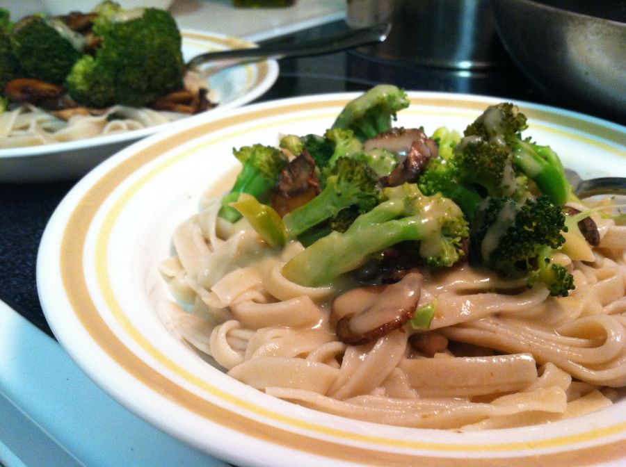 Because this recipe was not perfect, but definitely has a lot of potential, I’ll just give you the basics: soak dried cannelloni beans overnight and then let them simmer in a covered saucepan for about an hour (or until soft). Steam cauliflower on stovetop until soft as well. I would highly recommend using about a 3-1 ratio of cauliflower to beans; the beans have a surprisingly strong flavor and you do not need too many to reach that creamy texture. And, personally, I love the taste of cauliflower without too many additions. Sautee garlic and sliced mushrooms in pan. I then added the garlic and half of the mushrooms right into the sauce and blended with the immersion blender. Add rice milk or unsalted organic vegetable stock until you reach a sauce-like consistency. Fresh herbs or caramelized onions would almost definitely be a nice touch! Please let me know if you try this out and find the perfect combination...