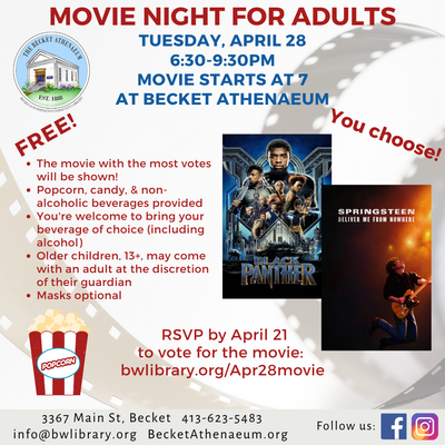 The movie with the most votes as of noon on April 21 will be shown. Movie starts at 7pm Popcorn, candy, & non-alcoholic beverages provided. You're welcome to bring your beverage of choice (including alcohol). Older children, 13+, may come with an adult at the discretion of their guardian. RSVP appreciated