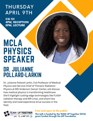 The MCLA physics department will host Dr. Julianne Pollard-Larkin Thursday in CSI 121, with a reception preceding the talk at 4pm in the CSI Atrium. Dr. Pollard-Larkin is a Full Professor of Medical Physics and Service Chief of Thoracic Radiation Physics at MD Anderson Cancer Center, one of the nation's top-ranked cancer centers. Her talk will weave together cutting-edge research in cancer treatment with her personal journey in science. She will highlight innovations like FLASH ultra-high dose rate radiotherapy and share how her identity, heritage, and upbringing have fueled her career. This talk is free and open to the public. Free parking on Blackinton and Montana Streets.