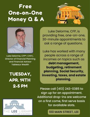 Luke Delorme, CFP, is providing free, one-on-one 30-minute appointments to discuss a range of topics such as debt management, budgeting, retirement and estate planning, Social Security, investing, and taxes. Appointments are available on Tuesday, April 14th from 2pm to 5pm at the Lee Library, 100 Main St., Lee. Registration is required. Please contact the Lee Library at (413) 243-0385 or sign up at the Circulation Desk. leelibraryma.org