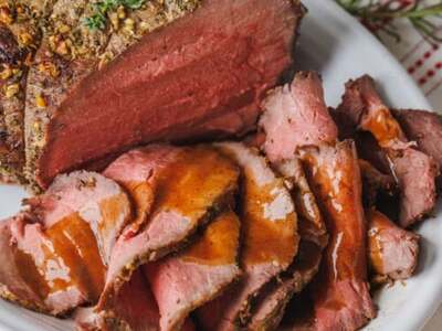 Roast Beef Dinner with Salad, Pasta, Potatoes, Vegetable, Bread and Coffee.