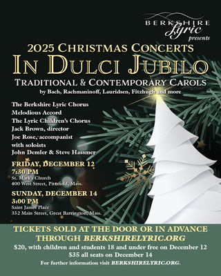 Berkshire Lyric presents In Dulci Jubilo, the second of their three 2025 Christmas Concerts on Sunday December 14. The choral program will take place at 3:00 at Saint James Place on Main Street in Great Barrington. Traditional and contemporary a cappella carols by Bach, Rachmaninoff, Lauridsen, Randall Thompson, the Berkshire's Charlie Fitzhugh and others will take advantage of the beautiful setting and acoustics of this former Episcopal church. The 85 voice Berkshire Lyric Chorus will be joined by our young women’s ensemble Melodious Accord and soloists Steve Hassmer and John Demler. Tickets are $35 and will be sold at the door or in advance through the website www.BerkshireLyric.org . This popular concert in Great Barrington has been sold out for several years, so purchase tickets early.
