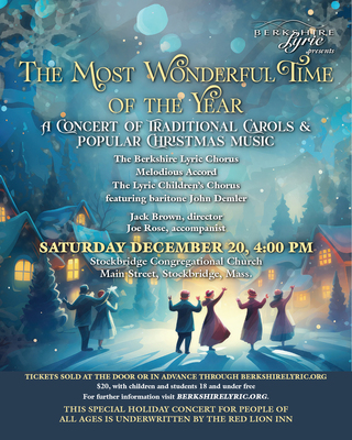 Berkshire Lyric presents The Most Wonderful Time of the Year, on Saturday December 20. The holiday choral program will take place at 4:00 at the Stockbridge Congregational Church on Main Street in Stockbridge. The concert of traditional and contemporary carols will also include a number of well known standards from the American holiday songbook. The 70 voice Berkshire Lyric will be joined by Lyric’s young women’s ensemble Melodious Accord and by Lyric’s Resident Vocal Artist John Demler. The Lyric Children’s Chorus will welcome a visit from Santa Claus at this old-fashioned holiday event geared for children of all ages. The concert is under the direction of artistic director and conductor Jack Brown and assisted by Joe Rose at the piano and pipe organ. There will be many opportunities to sing along. Tickets are $20 and will be sold at the door, with children and students 18 and under admitted for free. This Stockbridge concert is underwritten by the Red Lion Inn. Advance purchases can be made through the Berkshire Lyric website www.BerkshireLyric.org or member singers.