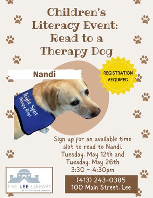 Nandi the Therapy Dog, will be available for a children's literacy event at the library. Available time slots begin at 3:30 p.m. Registration is required. Contact the library at 413-243-0385 or sign up at the Circulation Desk. More information here.