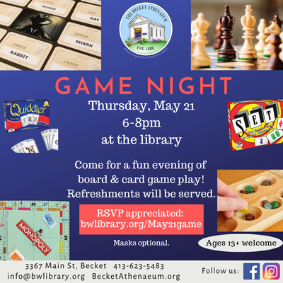 Join friends and neighbors for a fun evening of board and card games! If you have a favorite, please bring it along to share/teach to fellow gamers! Games the Athenaeum owns include Monopoly, Code Names, The All American History Trivia Game, Sorry, Chess, Quiddler (word game), SET, and many more! Refreshments will be served! You're welcome to bring your beverage of choice (including alcohol). Ages 13+ are welcome. RSVP appreciated.