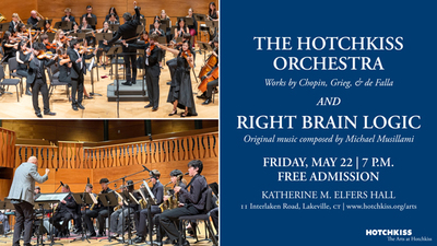 The Hotchkiss Orchestra and jazz ensemble Right Brain Logic take the stage on Friday, May 22 at 7 p.m. in Katherine M. Elfers Hall, Esther Eastman Music Center. Led by Fabio Witkowski, the orchestra performs works by Chopin, Grieg, and de Falla, while Michael Musillami directs Right Brain Logic in an engaging set of original compositions. Celebrating student musicianship and 20 years of performances in Elfers Hall, this dynamic evening of classical and jazz is free and open to all.
