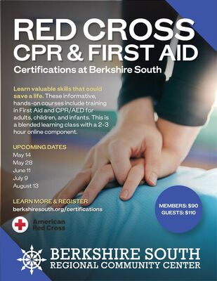 Berkshire South Regional Community Center hosts a hands-on courses include training in first aid and CPR/AED for adults, children, and infants. Red Cross certifications are valid for two years. This is a blended learning class with a 2-3-hour online component.