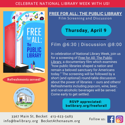 In celebration of National Library Week, join us for a screening of "Free for All: The Public Library," a documentary film which examines “how public libraries shaped a nation and remain a beloved sanctuary for Americans today.” The screening will be followed by a short (and optional) round-table discussion about the power of libraries – ours and others! Refreshments including popcorn, wine, beer, and non-alcoholic beverages will be served. Come early to get settled. Movie starts at 6:30 and discussion at 8pm. RSVP appreciated.