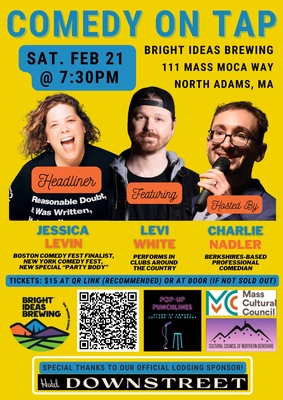 Stand-up comedy returns with headliner Jessica Levin, feature act Levi White, and host Charlie Nadler! Bright Ideas Brewing in North Adams, MA!