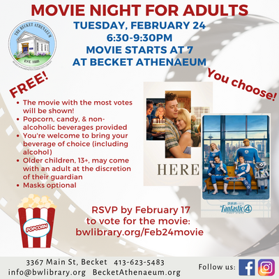 Becket Athenaeum hosts a storytime from 10:30 to 11:30 followed by an hour of stay and play with toys, games, puzzles, and snacks for the kids, along with coffee, tea, snacks, and time for connection for the caregivers. Stop by for either or both.