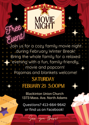 Looking for something fun and cozy to do during February winter break? Come join us for a FREE Family Movie Night at Blackinton Union Church! Family-friendly movie, Popcorn & refreshments.