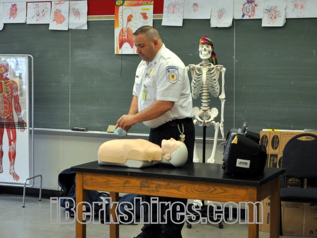 Seventh-graders at Sullivan School in North Adams learned emergency response protocols from Amalio Jusino, of North Adams Ambulance Service, on Friday. [photos by J. Guerino]
