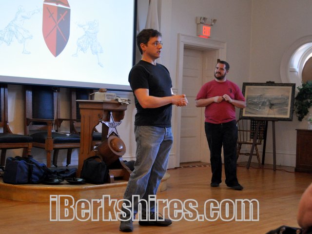 The Association for Renaissance and Medieval Swordsmanship, ARMS, performed a historical sword demonstration in the Adams Free Library.